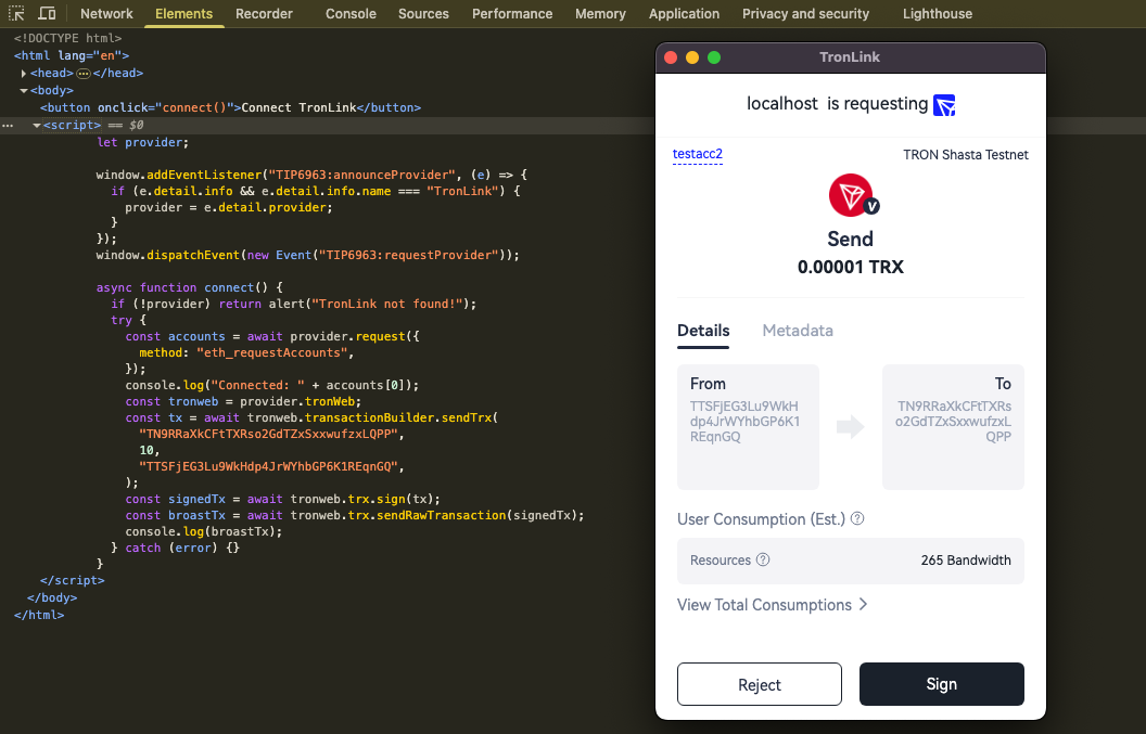 In the process of completing a transaction, TronWeb needs to get TronLink to sign it. The signing process is done in TronLink, and then the signed transaction is returned to TronWeb for broadcast. Let's understand it by an example.